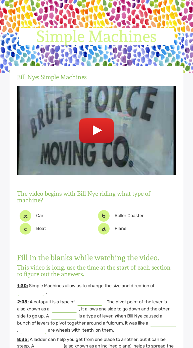Bill Nye Simple Machines Worksheet Answers : Simple Machine Lesson Plan Kimberly Wall Lesson Plan Machines / Use the time at the start of each section to figure out the answers, which are located in the word bank at the bottom.